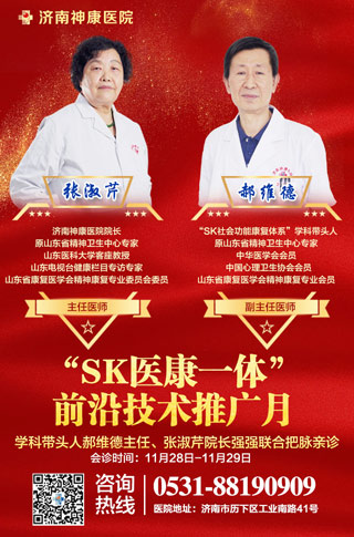 “SK医康一体”治疗与康复体系是济南神康医院心理精神疾病复发预防与社会功能康复规划指导中心专家团队经数十年潜心钻研,结合临床实际而创立。该体系秉承“医康一体 身心康复 回归社会”的理念,全国率先采用精神疾病社会功能康复治疗体系,开展个体化、系统的治疗与康复。采用“中西医结合”中西医结合治疗消除症状,稳定病情,在治疗的同时进行系统评估和社会功能康复训练,达到临床治愈后通过对精神心理患者提出个体化的、系统的康复规划和指导,帮助患者和家属明确康复方向,维持患者病情稳定,预防复发,改善患者生活质量,更好地适应院外生活、保持和恢复社会功能,最终达到精神心理疾病的全面康复,成为一个健康的社会人,减轻社会和患者家庭的负担,真正使患者重返社会。